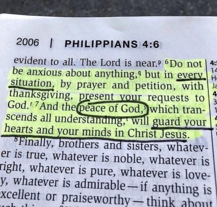 “ Do not be anxious about anything, but in every Situation, by prayer and petition, with thanksgiving, present your requests to God. And the peace of God which tran sends all understanding, will guard your hearts and vour minds in Christ Jesus.” - PHILIPPIANS 4:6